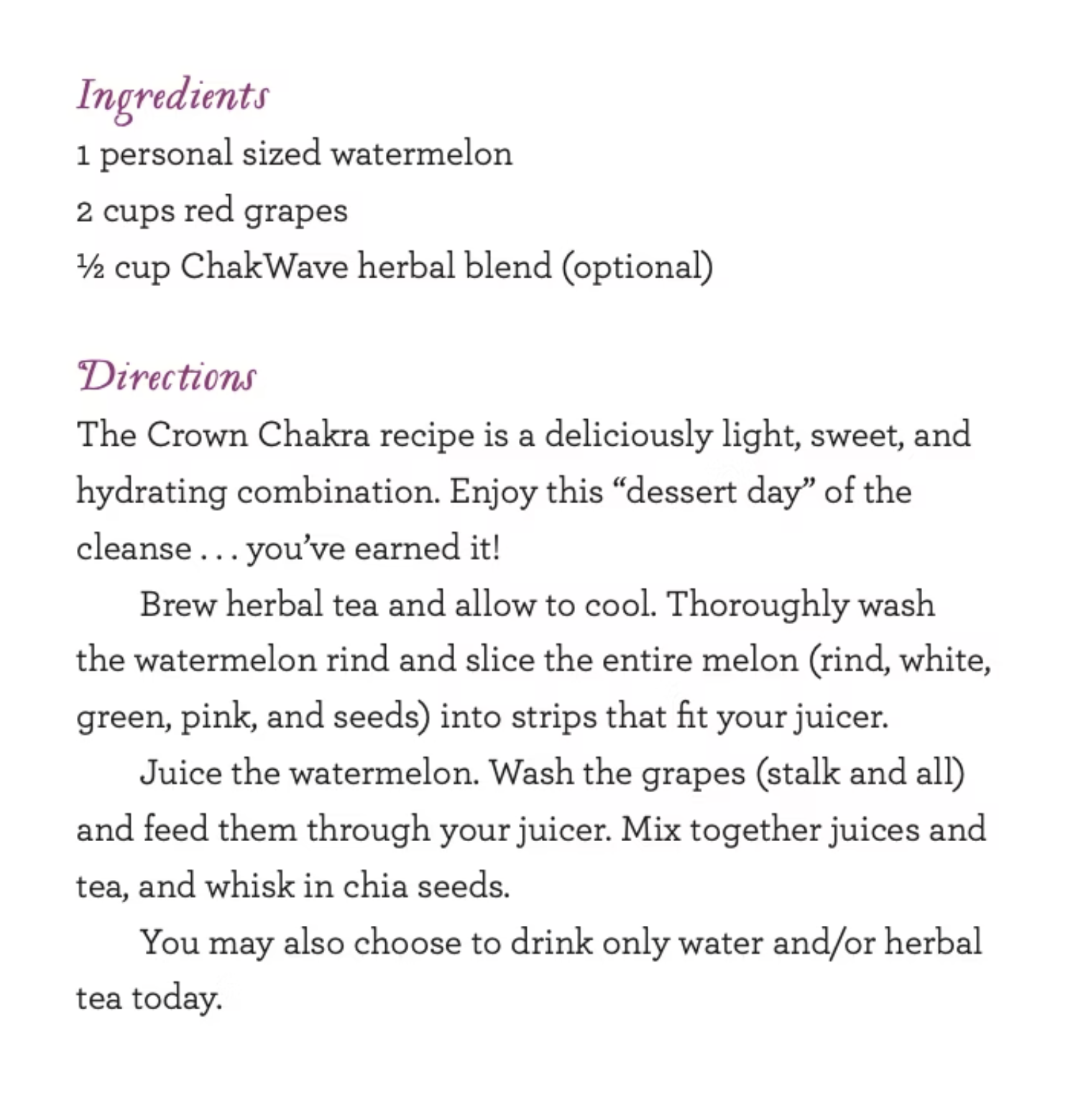 Progress Cleanse Course Complete & Continue Next Lesson Learn More Welcome! 5 Lessons Hello and Welcome! What is a chakra? Why raw and organic? Color Therapy Course Modifications Day 1 Root 4 Lessons Welcome to day 1 ~ Root Root Juicing Red Root Yoga Root Journaling Day 2 Sacral 4 Lessons Welcome to day 2 ~ Sacral Sacral Juicing Orange Sacral Yoga Sacral Journaling Day 3 Solar Plexus 4 Lessons Welcome to day 3! Solar Plexus Juicing Yellow Solar Plexus Yoga (Copy) Solar Plexus Journaling Day 4 Heart 4 Lessons Welcome to Day 4! Heart Juicing Green Heart Yoga Heart Journaling Day 5 Throat 4 Lessons Welcome to day 5! Throat Juicing Blue Throat Yoga Throat Journaling Day 6 Third Eye 4 Lessons Welcome to day 6! Third Eye Juicing Indigo Third Eye Yoga Third Eye Journaling Day 7 Crown 4 Lessons Welcome to day 7! Crown Juicing Violet Yoga Violet Journaling Cleanse Course Complete & Continue Next Lesson Learn More Day 7 Crown Crown Juicing