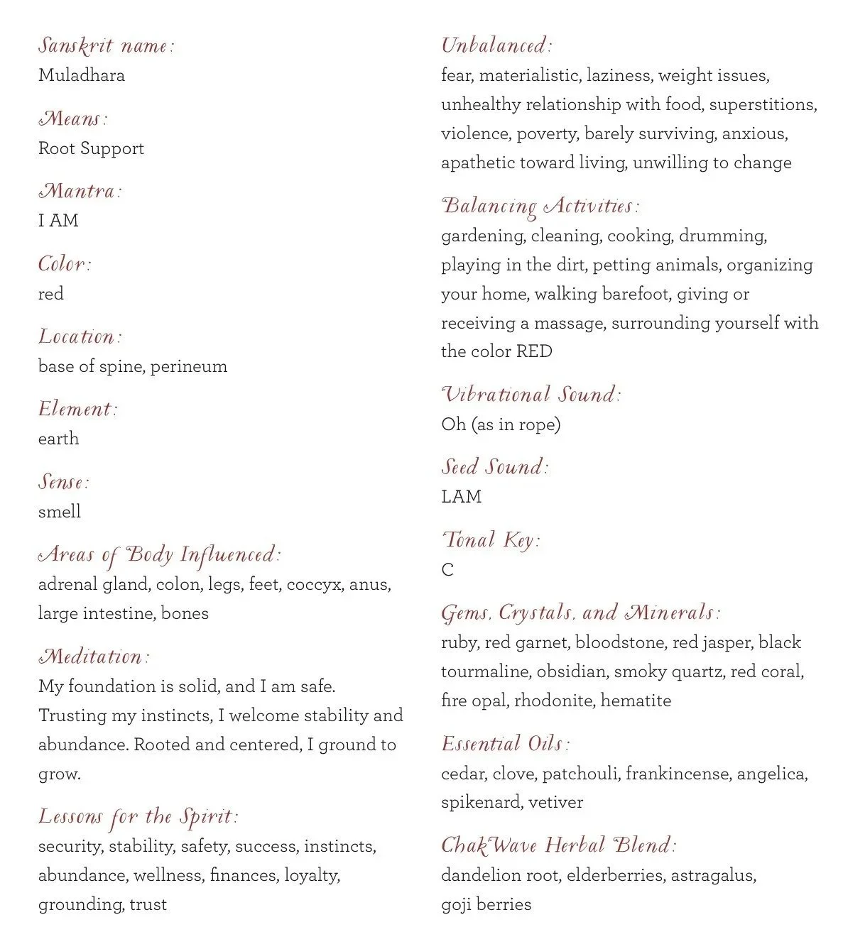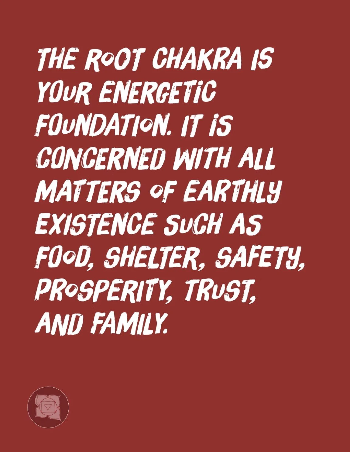 Balancing the root chakra asks you to face your fears in order to step into the life you are meant to live. If not residing in a place of happiness and truth, changing your circumstances, situation, and point of view is vital. Consider and recognize situations of physical, mental, verbal, or systemic violence or abuse present in your life, and take action in removing yourself from these unhealthy scenarios.
