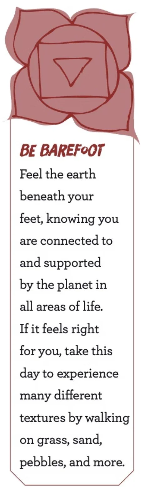 Visualize sending red taproots down into the earth, cracking through the floor, the carpet, rug, wood, cement, plumbing, Earth’s crust, tectonic plates, and molten lava until your root tendrils wrap around the core of the planet. Be truly present in your body.