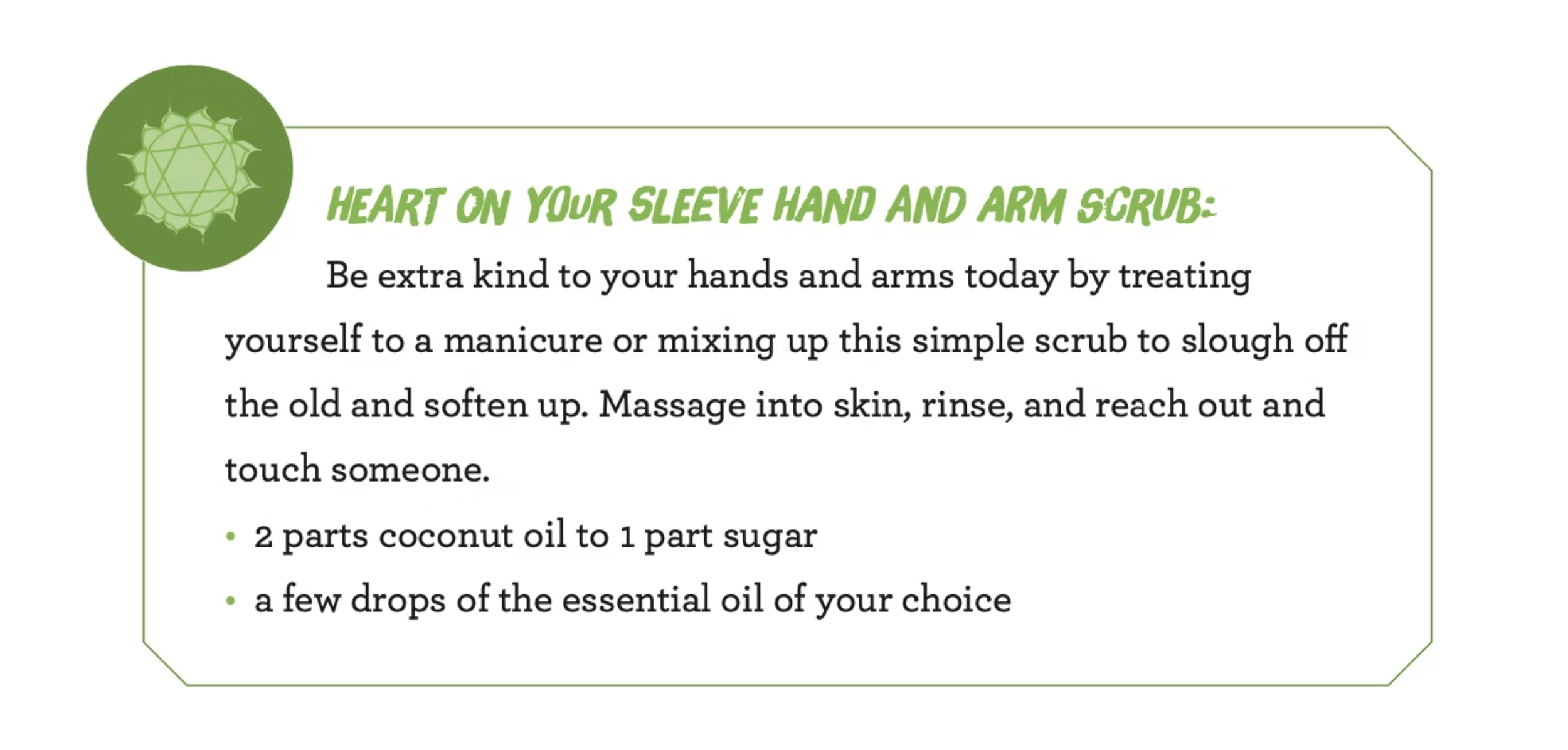 Your chest, arms, hands, and fingers are extensions of your heart. Let everything and everyone you touch be an act of love. Wear a green shirt or paint your nails green to remind yourself of this as you hold, touch, caress, exalt, honor, and hug it out! Open arms welcome open feelings of love and compassion, sharing and caring. In a hug from the heart, bodies intertwine and energies are melded. Turn “ughs” into “hugs” as you vibrate green love vibes.