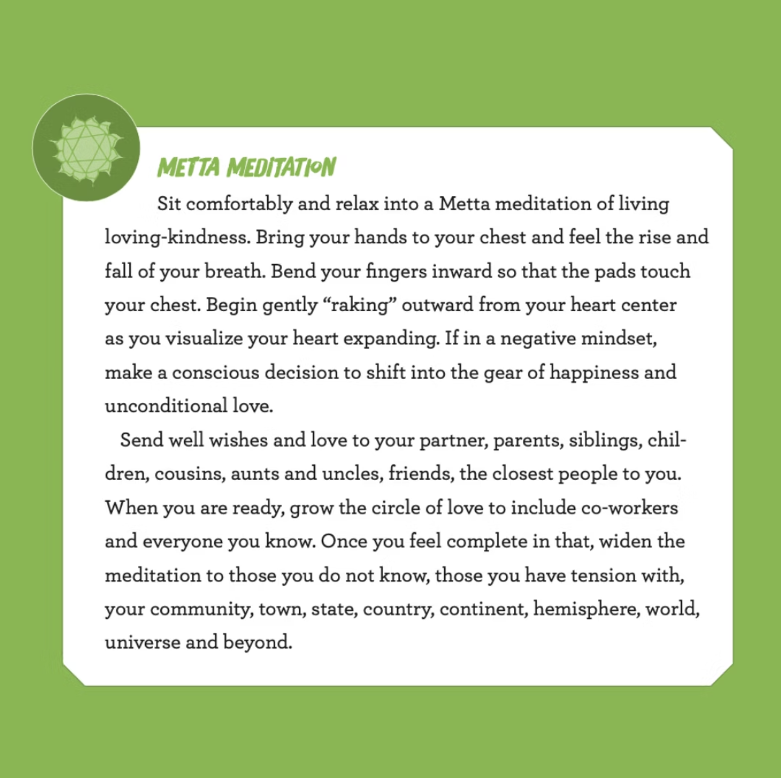 Your breath is an incredibly powerful energy, and the element associated with the Heart Chakra is air so it’s no wonder when our hearts are full of love we feel like we are “walking on air!” Hunch your shoulders inward and try finding your breath. In this constricted posture, it doesn’t work too well. Shallow breathing and asthma are symptoms of underdeveloped heart health. Now roll your shoulders back, sitting straight and feeling the space created. You may feel instantly more open to giving and receiving. Slow, deep, long breaths are the key to balancing and attracting love.