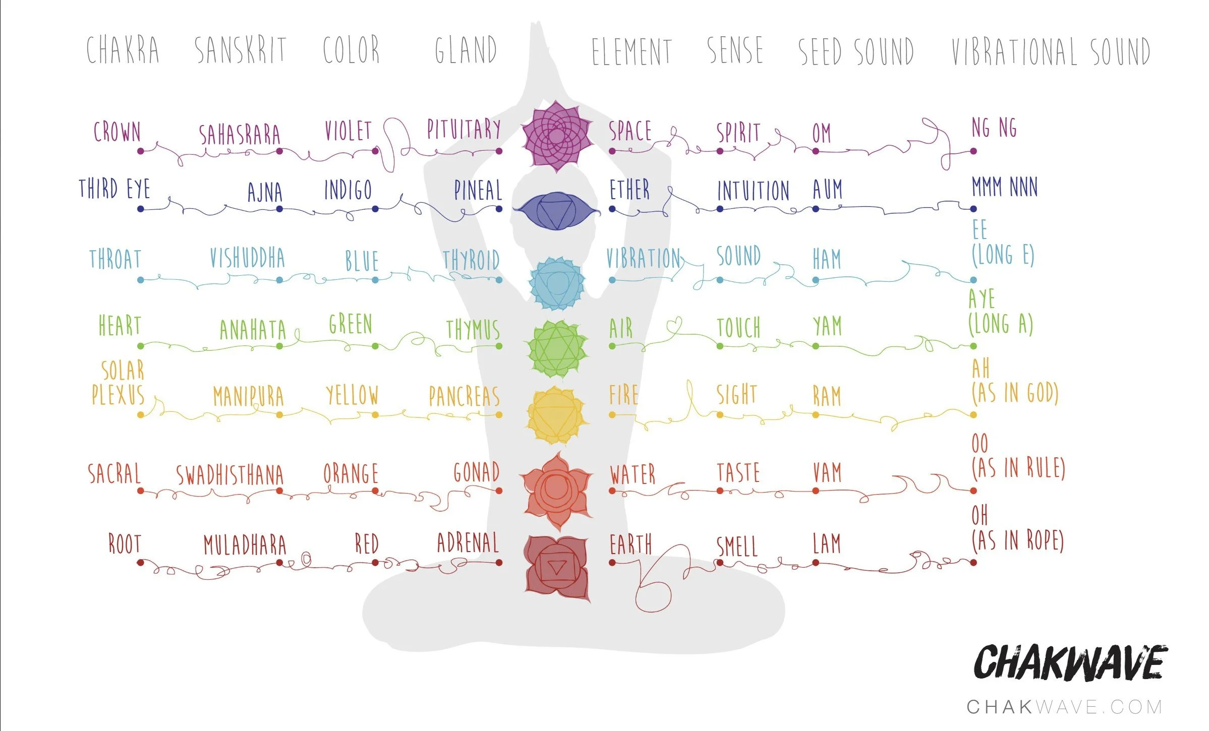 Chakras provide a language for the unseen. Simultaneously tangible and symbolic, the spiraling energy of the chakras corresponds with glands in the endocrine system, organs in the body, and nerve ganglia of the spinal column as well as mental, emotional, and spiritual health. Also, each chakra corresponds directly with a color of the rainbow.